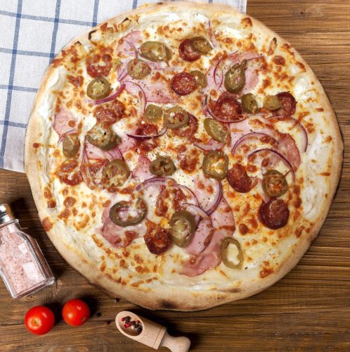 Fokhagymás tejfölös alap, sajt, kolbász, tarja, füstölt sajt, jalapeno paprika, lilahagyma