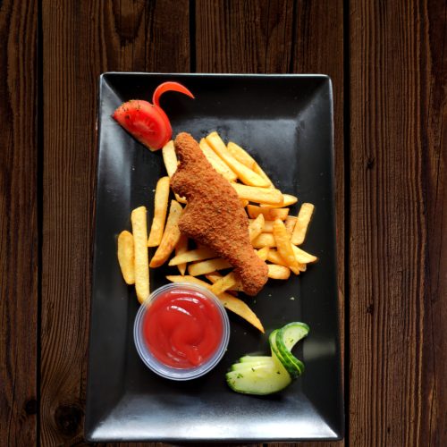 Dínó alakú csibefasírt, kis krumpli, ketchup